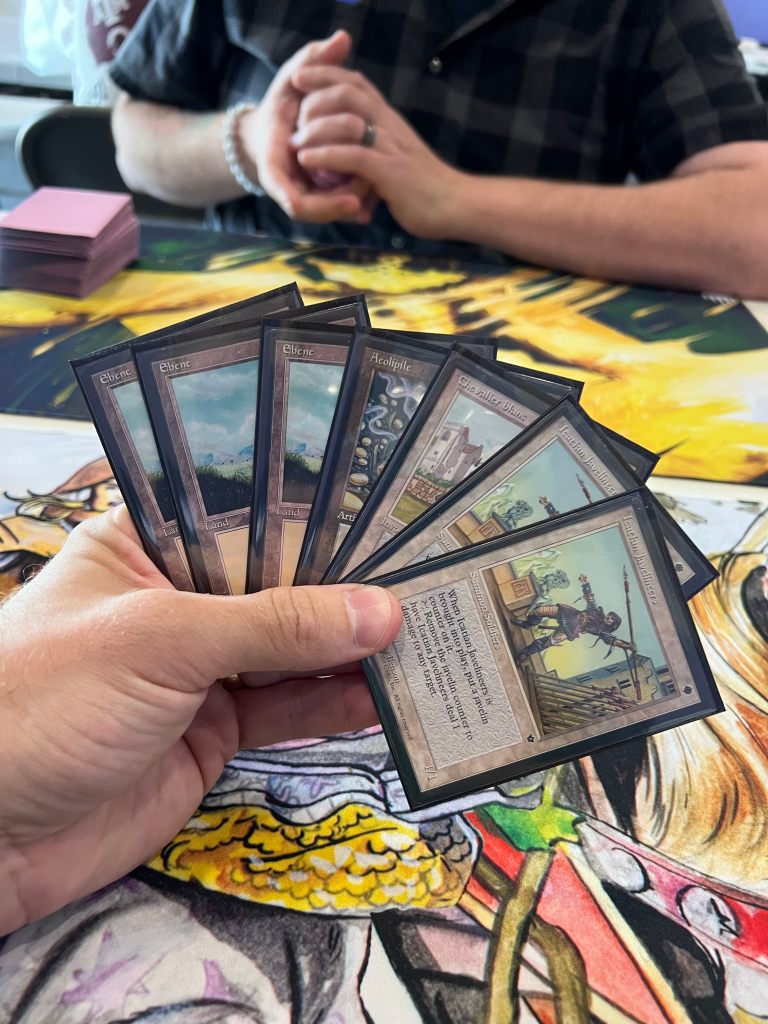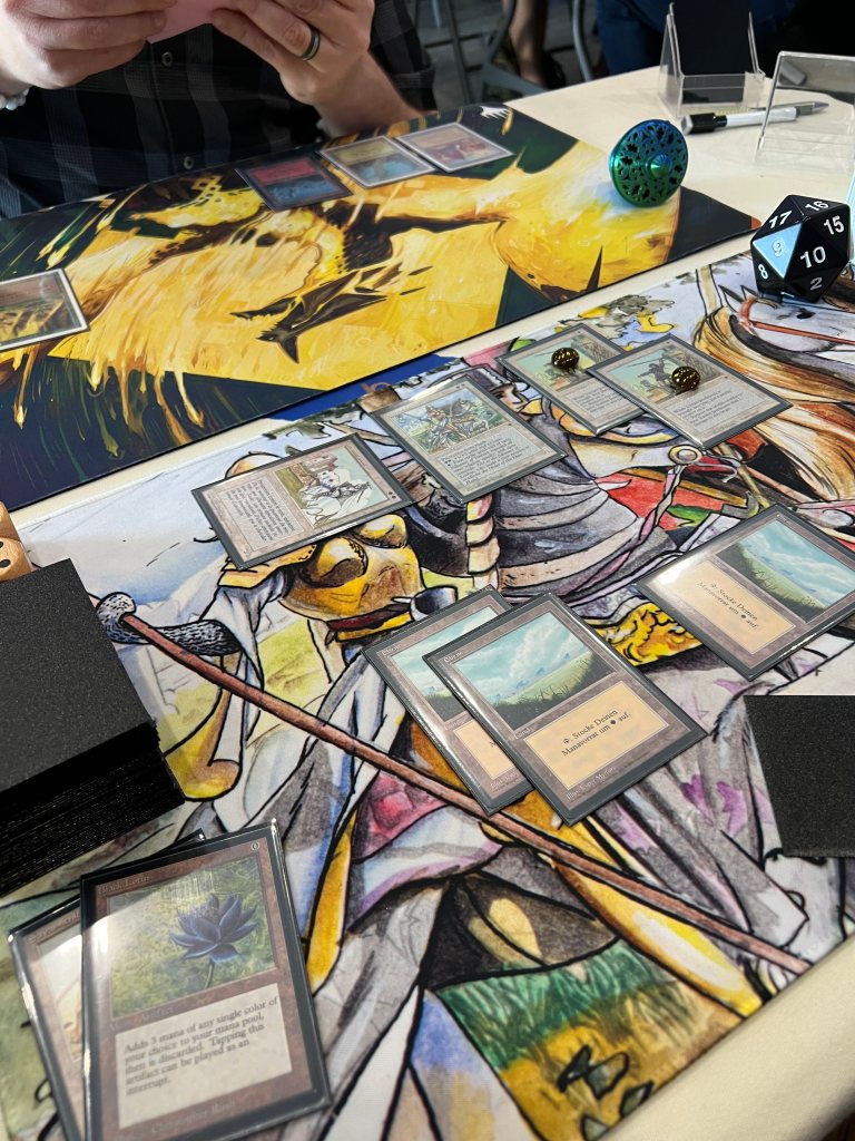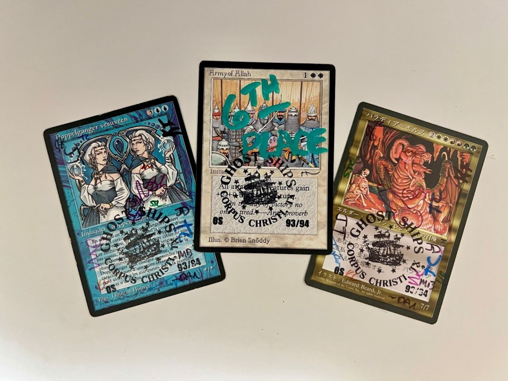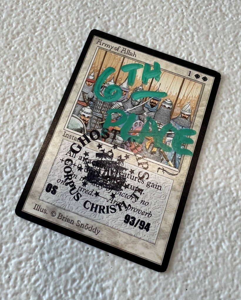 The Top 8 drafted from among the stamped prize cards, a collection that included a Beta Sinkhole, a Golgothian Sylex, a FBB Strip Mine, among other cards. Simon helped steer people’s picks a bit to make sure the Army of Allah was left for me when it came my turn to select! I always like to have a card that was in my deck (or at least fits my deck) for my prize card and so it was really nice to get this Army for it. Ironically, the last time I played this deck at the 2024 Romancing the Stones Festival of Friendship in Austin, I also won an Army of Allah (that time for a 4th place finish).