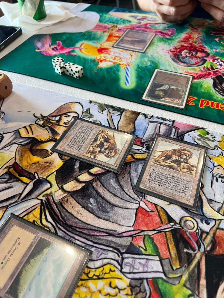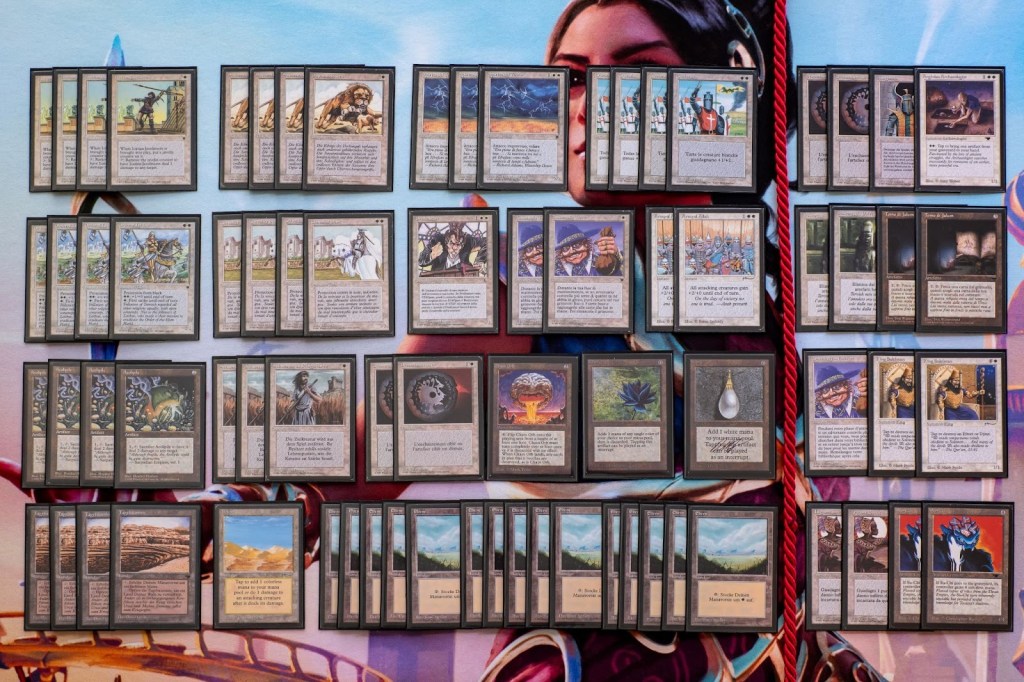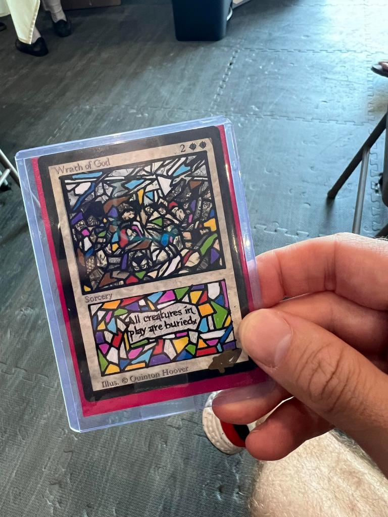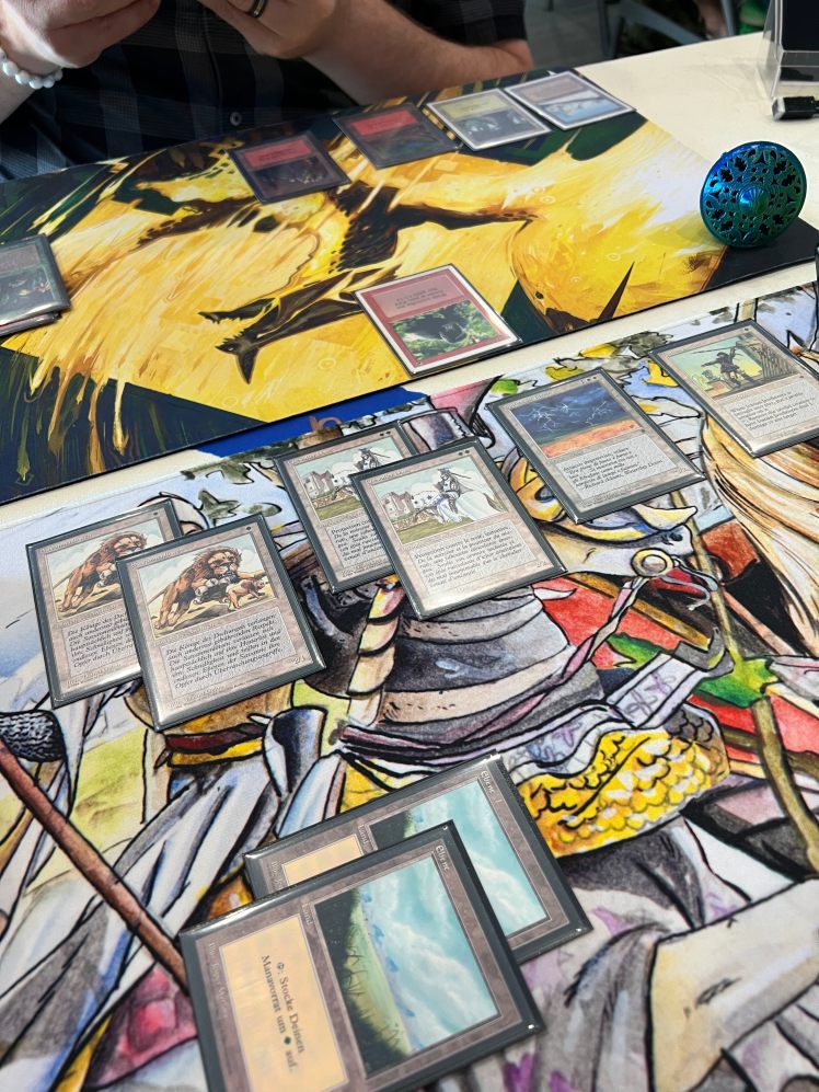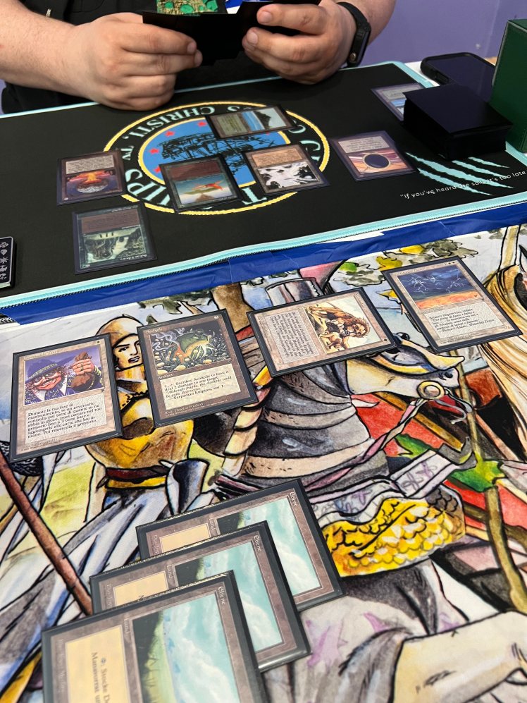 The Top 8 drafted from among the stamped prize cards, a collection that included a Beta Sinkhole, a Golgothian Sylex, a FBB Strip Mine, among other cards. Simon helped steer people’s picks a bit to make sure the Army of Allah was left for me when it came my turn to select! I always like to have a card that was in my deck (or at least fits my deck) for my prize card and so it was really nice to get this Army for it. Ironically, the last time I played this deck at the 2024 Romancing the Stones Festival of Friendship in Austin, I also won an Army of Allah (that time for a 4th place finish).