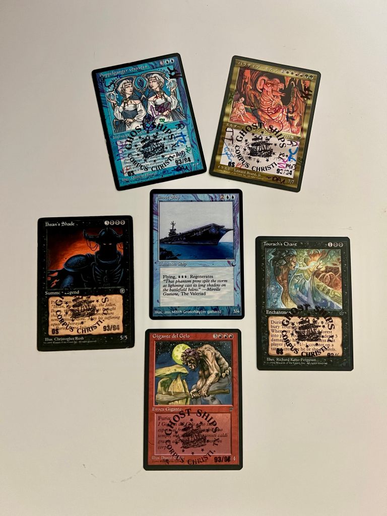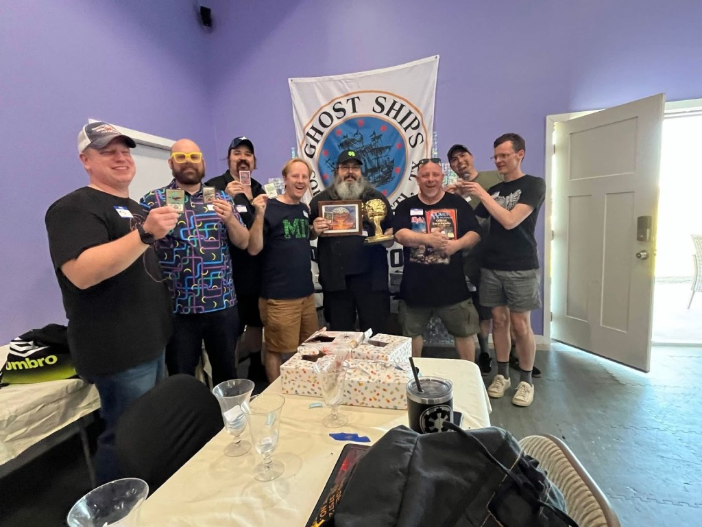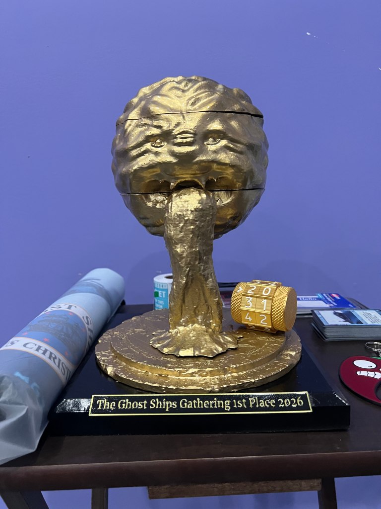 To both their benefit and detriment, Old School tournaments are more than just tournaments. They are whole productions, with commemorative cards and raffles for charity and all sorts of hoopla. (I say detriment because it’s a lot of work to put these on, which means they happen less often than they might.) The first ever Ghost Ships Gathering was no exception. Tracey and his co-organizers prepared an insane level of swag, with buttons and little film strips made by his daughter, and a totally wicked trophy for first place. One look at it and I was reconsidering what I chose to play that weekend, wondering if I should play something more serious. 😀