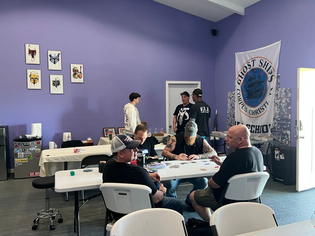 The drive down Friday night was uneventful. We left Houston around 2:30PM and arrived in Corpus just in time for dinner. After scouring reviews, Simon found a place just down the street from our hotel with high marks. But when we got there, we discovered it wasn’t quite what we thought, being a literal drive-through–a giant barn with a bar on the side and room for automobiles to drive through for…something. We decided to pass and went for a popular steakhouse across the street, which was satisfactory but unspectacular. A quick stop to say hello to my cosplay friends who own a game shop in town (which was PACKED–they’ve got quite a business going!) and we were off to the venue for some night-before-tournament casual games of AAA and Premodern.