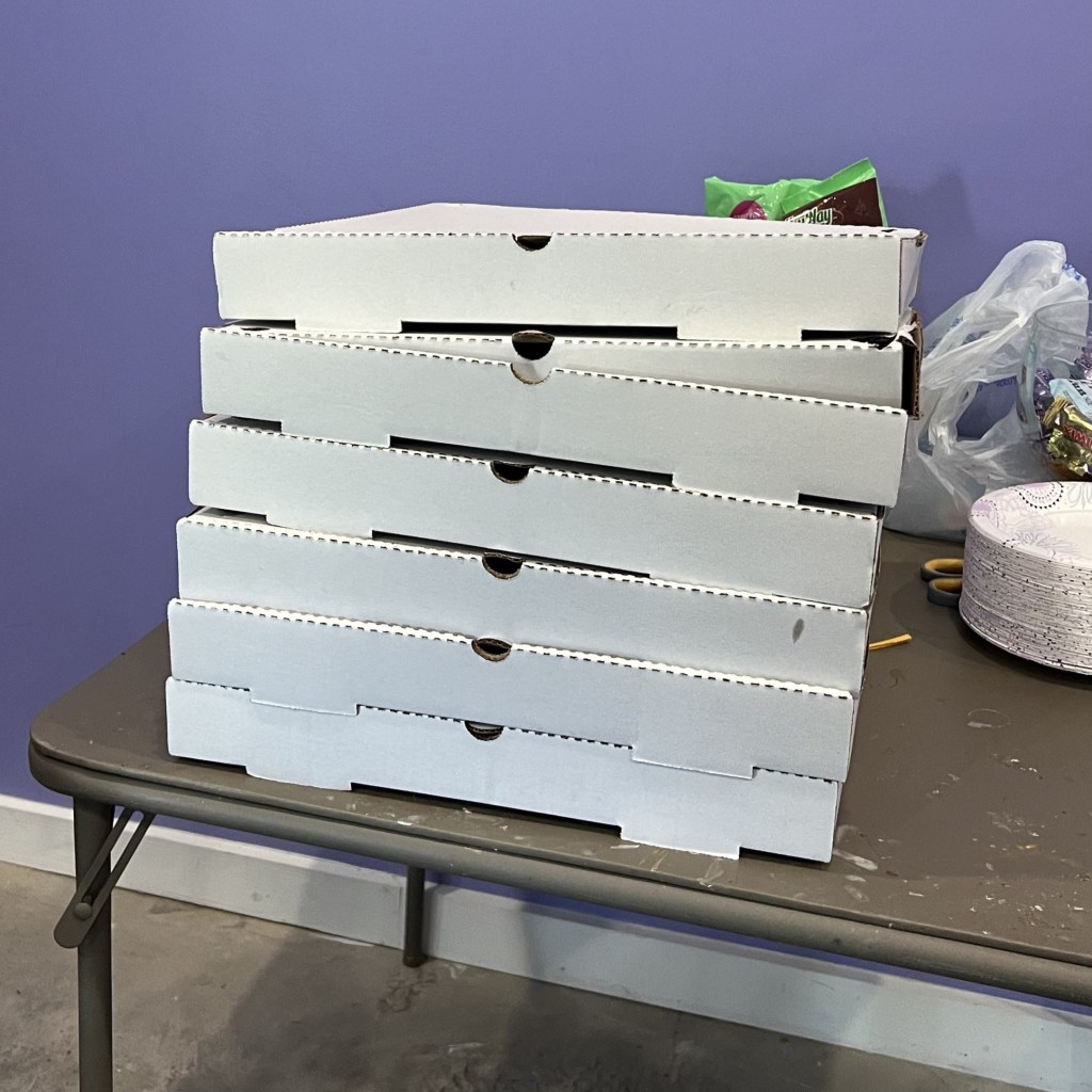 With 19 players, the plan was for five rounds, so this should be the end of the tournament. But it’s only about 3:45, pretty amazing when we started around 11:45. The pizza arrives at this point, after a somewhat lengthy wait because the store didn’t open until 3PM. We decide we will all eat and then decide if we want to play another round after we’ve regained our strength.